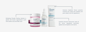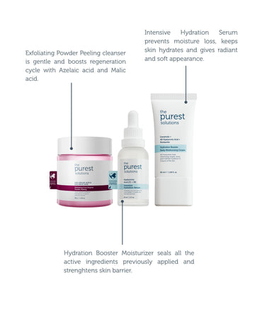 A value set with a powerful cleanser + hydration serum and moisturizer to clear pores and hydrate skin for people with pore problems having dry/sensitive or combination skin.