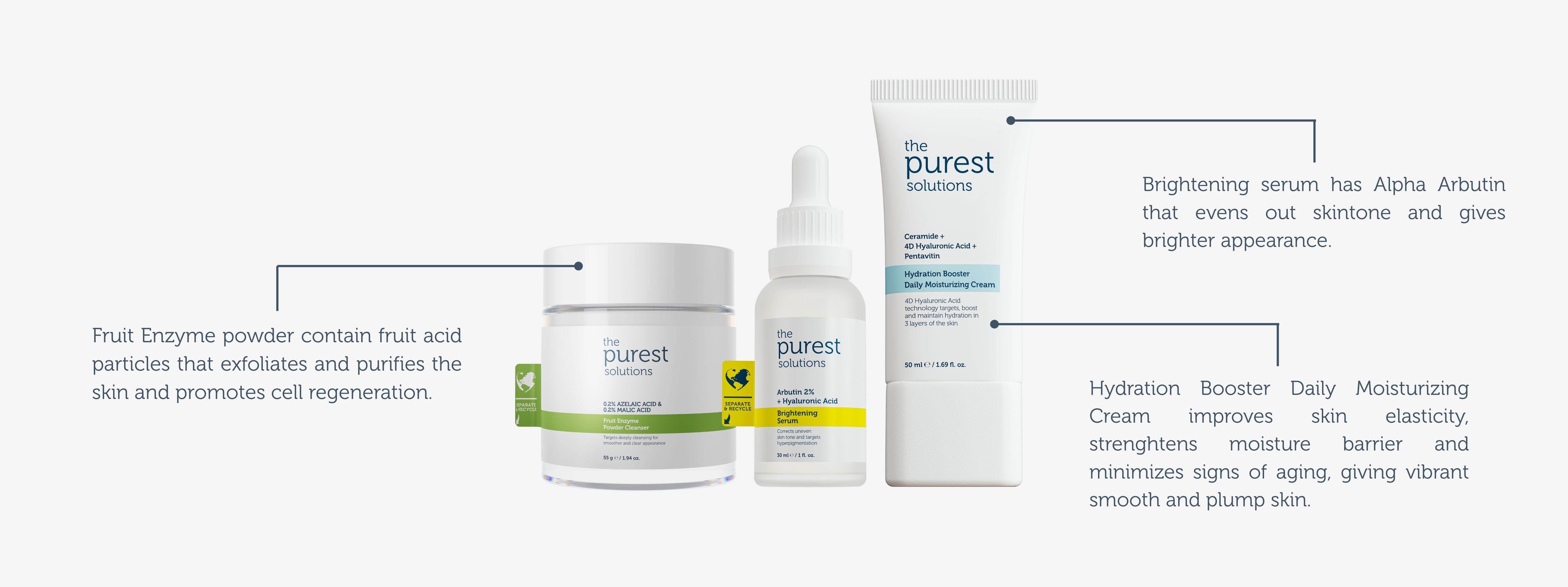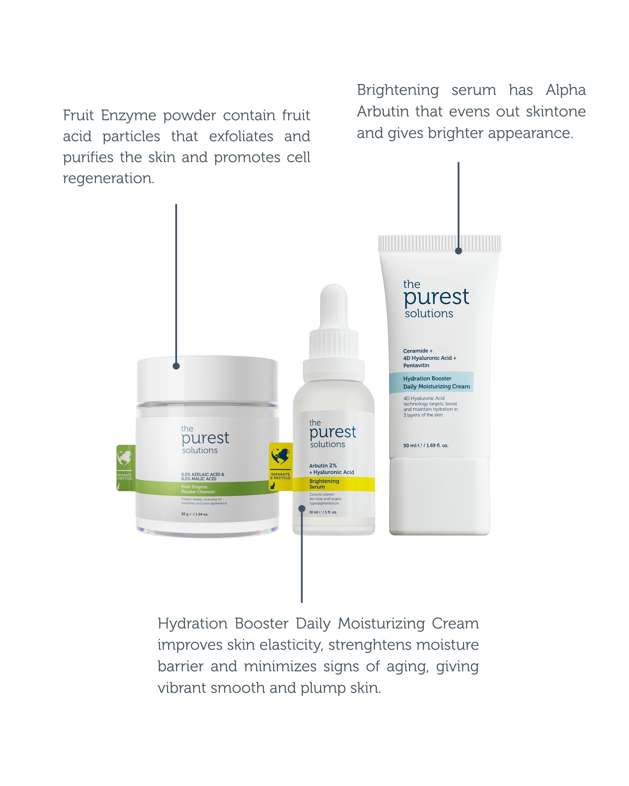 The products in this set contain exfoliants such as Azelaic Acid & Malic Acid, active ingredients such as Alpha Arbutin or Vitamin C and Hyaluronic Acid, and hydrating ingredients such as ceramide and Pentavitin.