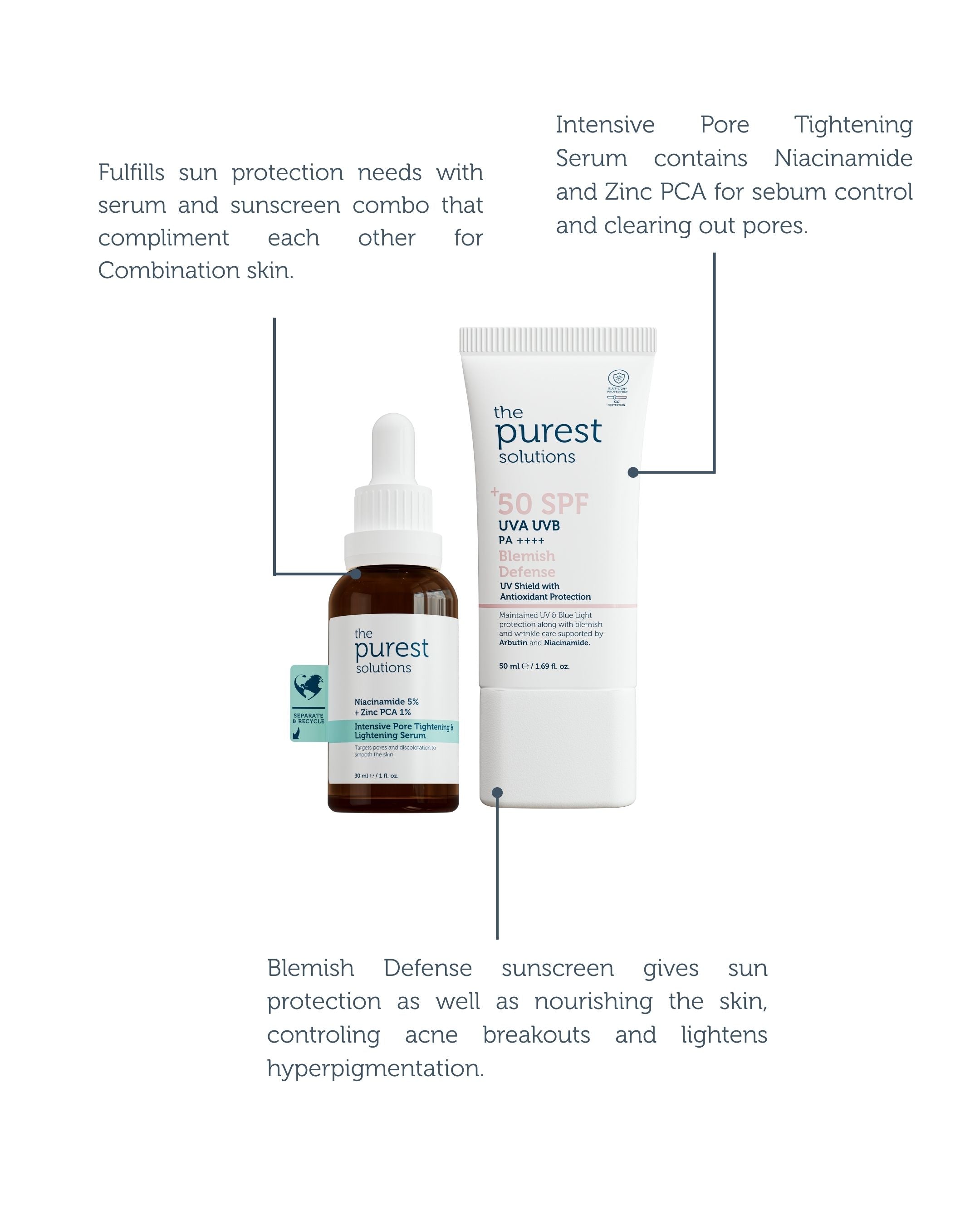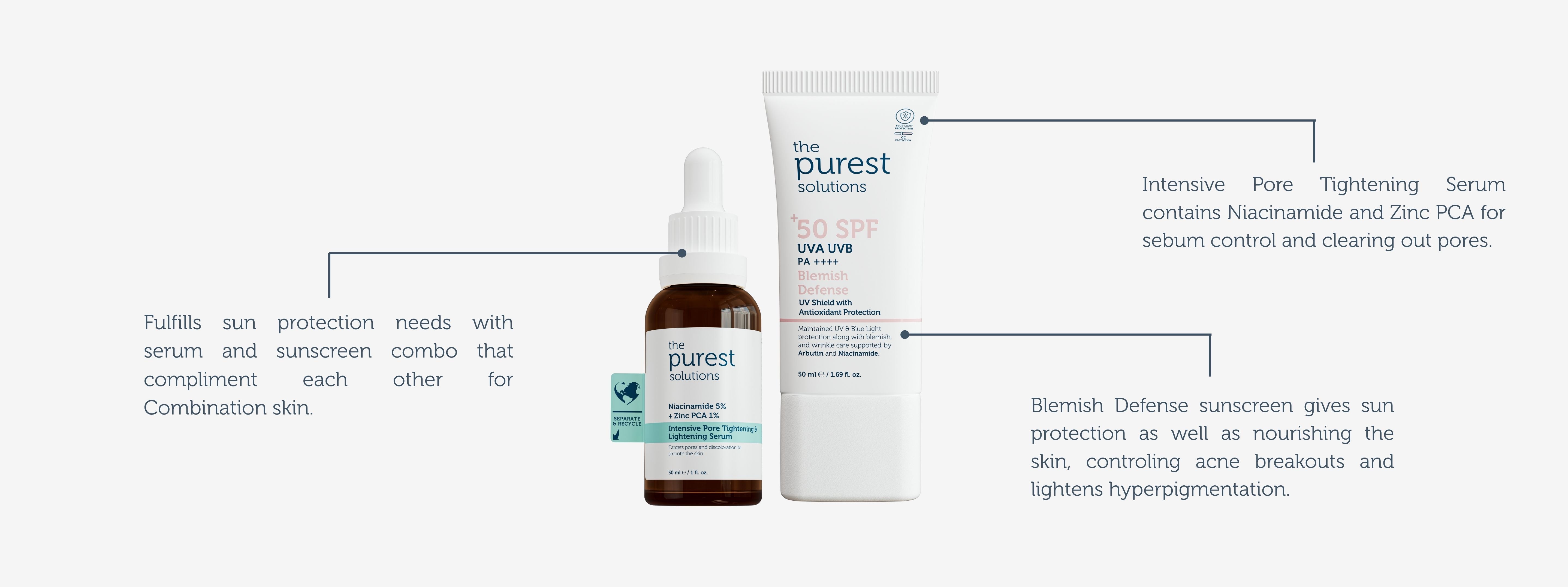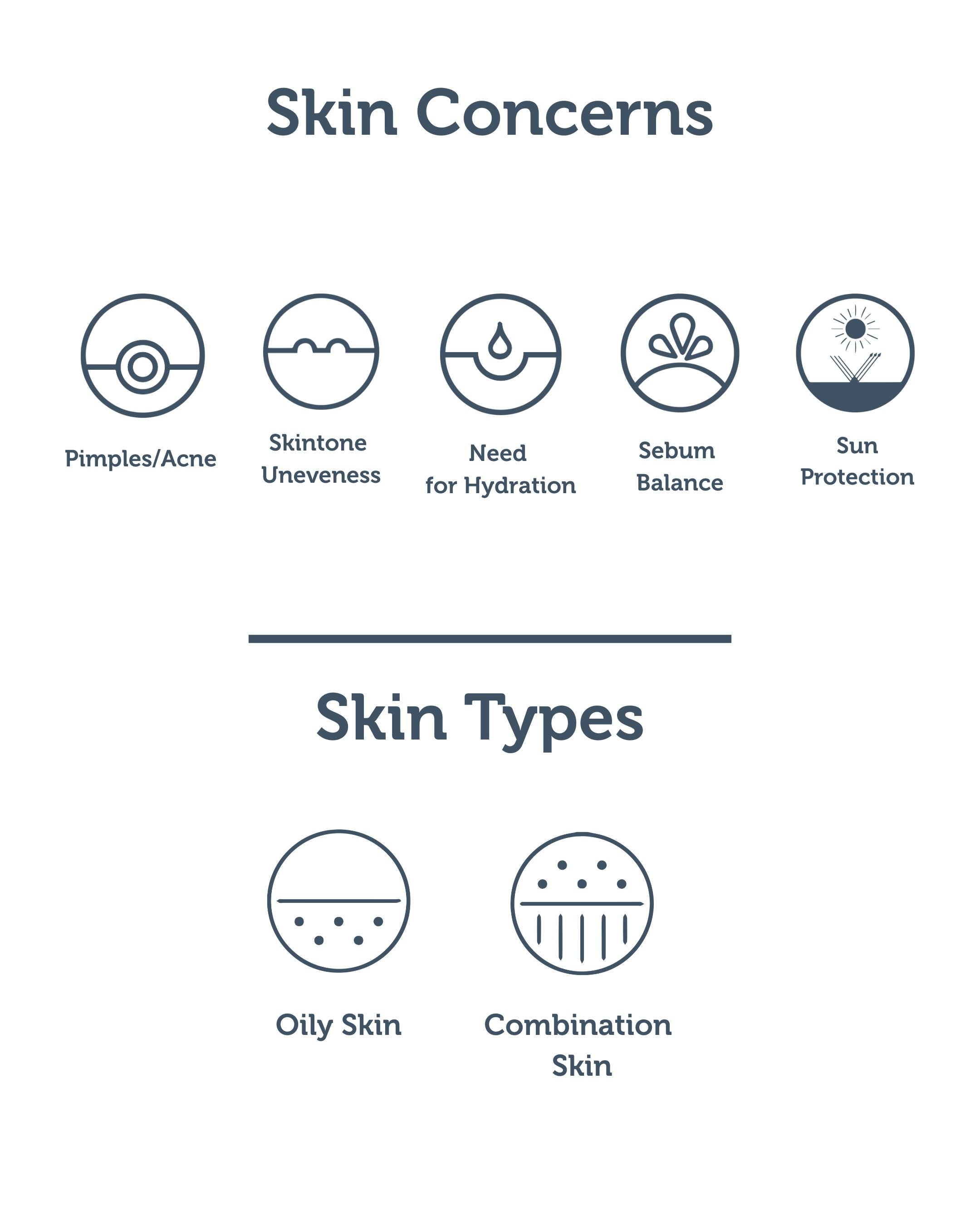 Regular use of these products will help in dealing with skin issues such as acne problems, sebum balance, dark spots, uneven skintone, need for hydration, sun protection and blue light protection.