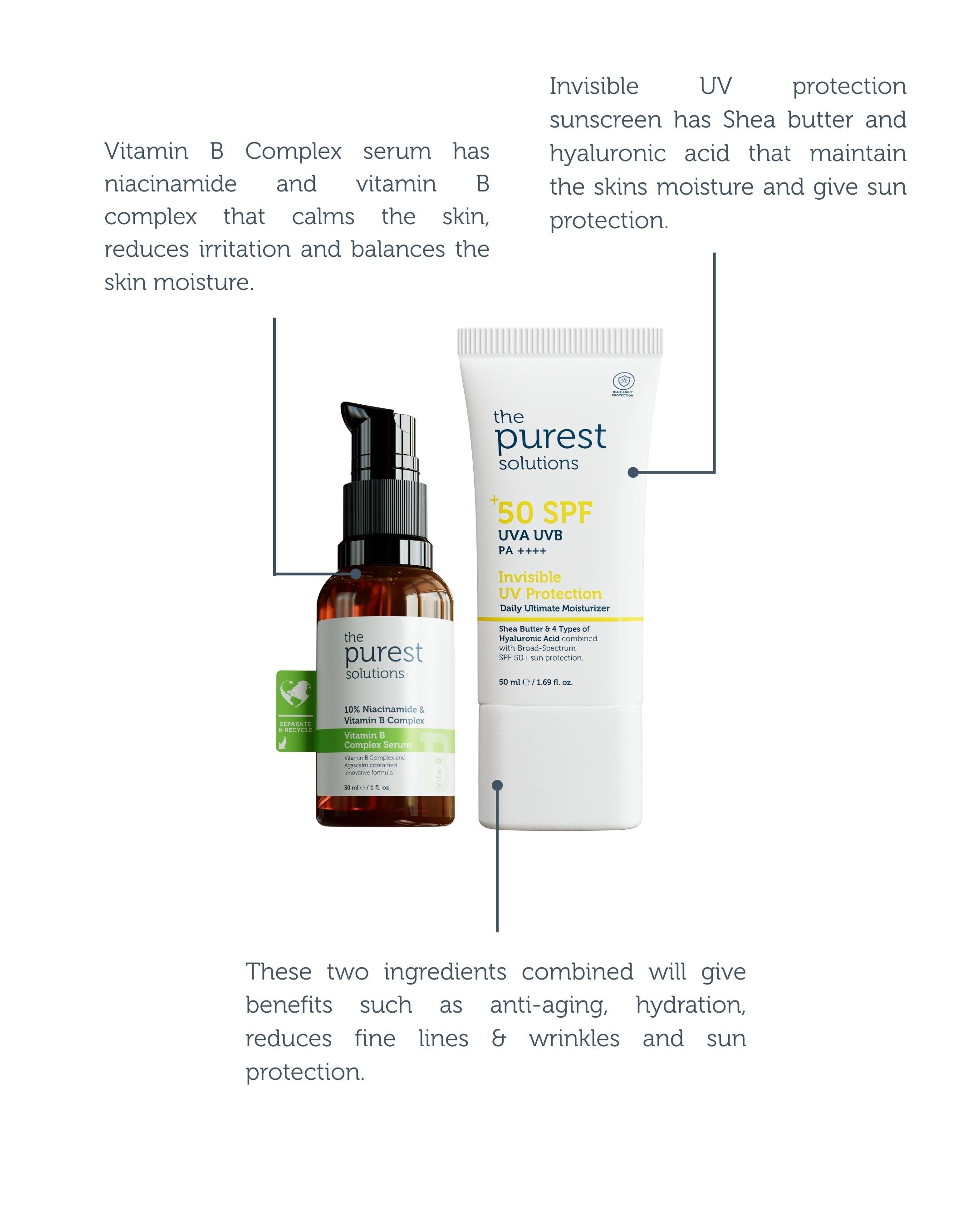 - After cleansing, apply a few drops of Vitamin B Complex Serum evenly to full face until absorbed.